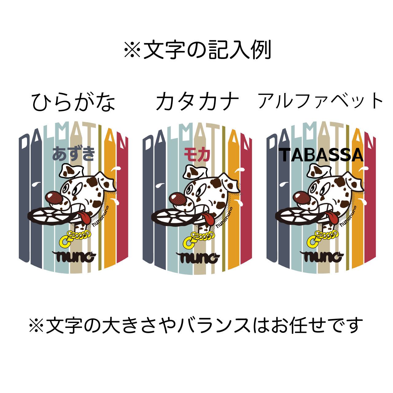 オリジナルのダルメシアングラフィックと、愛犬の名前・キャップの色をカスタム出来ます。